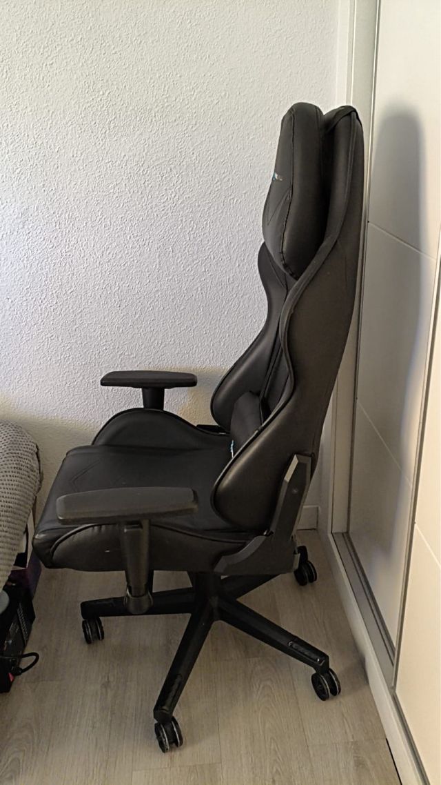 Silla de gaming ergonómica en color negro. - Diseño deportivo y confortable. - Reposabrazos acolchados. - Base con ruedas para fácil movilidad.