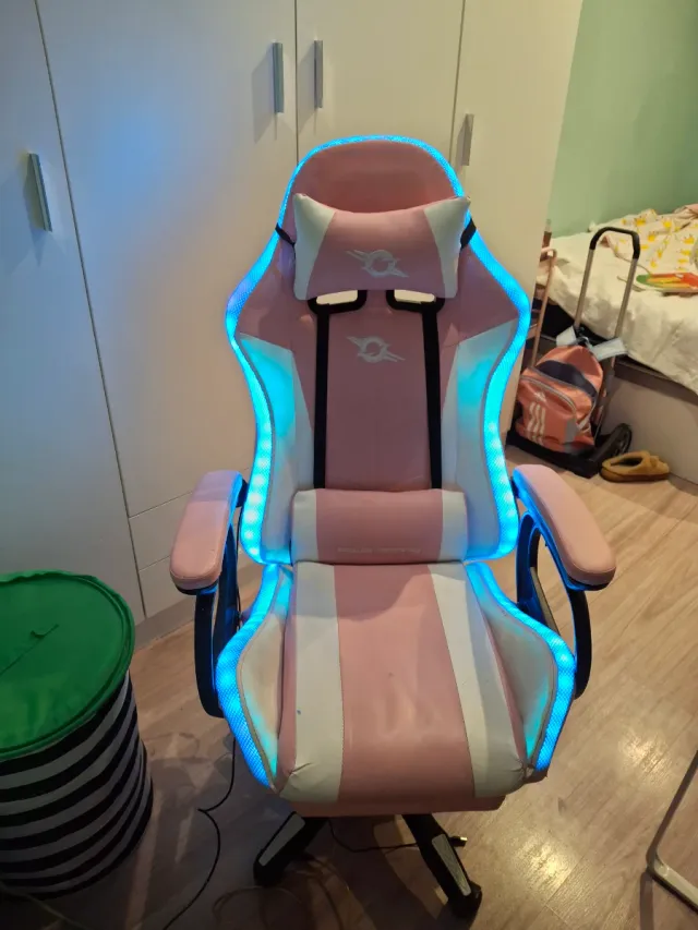 Detalles del productoSilla de gaming en color rosa con detalles en blanco y luces LED azules integradas.
