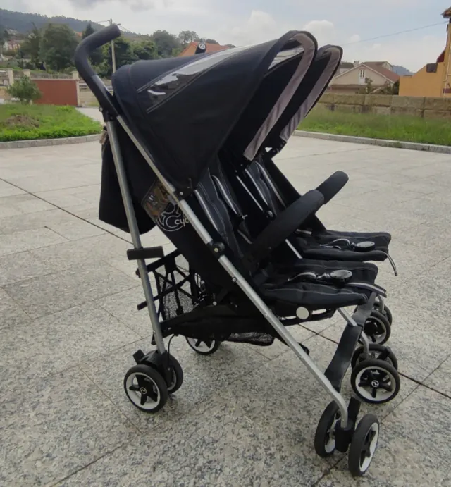 Silla de paseo gemelar Cybex en buen estado, lista para usar. - Color negro. - Capotas dobles. - Cesta de almacenamiento inferior. - Plásticos de lluvia