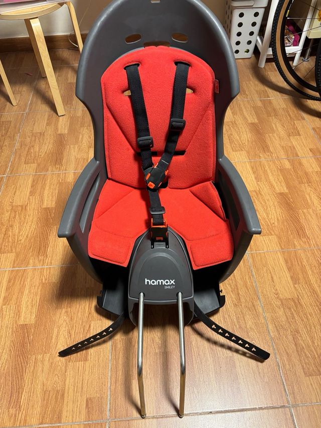 Detalles del productoSilla infantil Hamax Smiley para bicicleta, color gris y rojo.