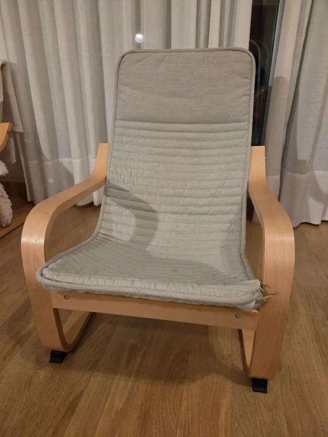 Detalles del productoSilla mecedora infantil de Ikea, modelo Poäng. Su diseño curvo proporciona un balanceo suave y relajante.