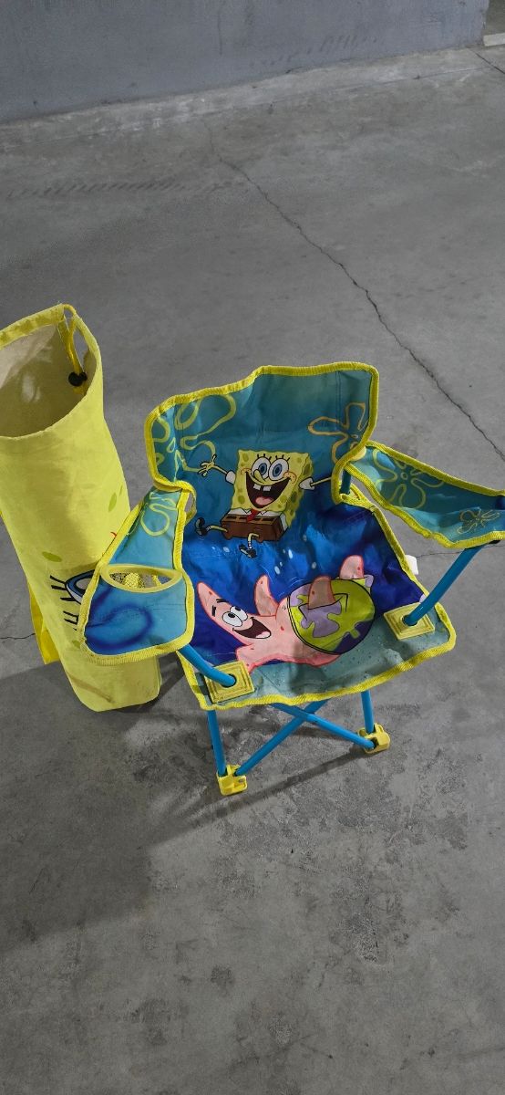 Silla plegable infantil con diseño de Bob Esponja y Patricio. - Estructura de metal azul. - Tejido con estampado. - Incluye funda de transporte amarilla.