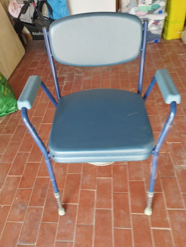 Silla inodoro portátil, ideal para personas con movilidad reducida. Se encuentra en buen estado. - Estructura de metal resistente. - Asiento acolchado y cómodo. - Fácil de limpiar.
