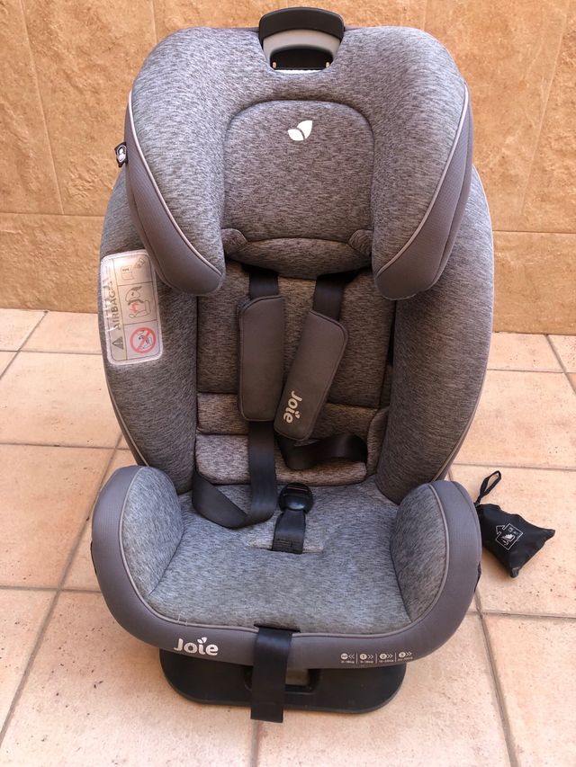 Silla de coche Joie en color gris, con sistema de anclaje Isofix. - Tapicería acolchada. - Arnés de seguridad de 5 puntos. - Reposacabezas ajustable.