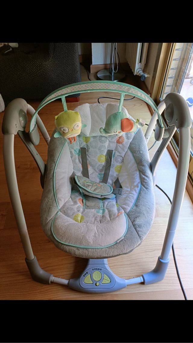 Preciosa silla mecedora para bebé, en perfecto estado. - Ideal para relajar al bebé. - Diseño moderno y elegante. - Incluye dos peluches.