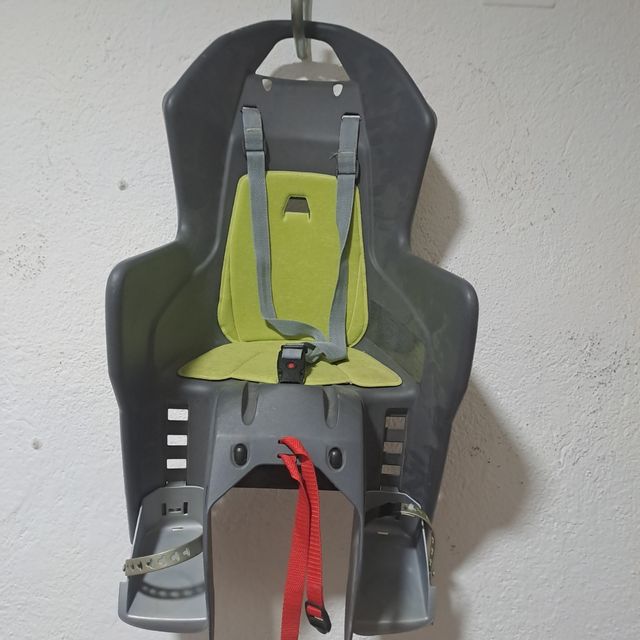 Detalles del productoSilla para transportar niños en bicicleta. Cuenta con un asiento acolchado y cinturones de seguridad.