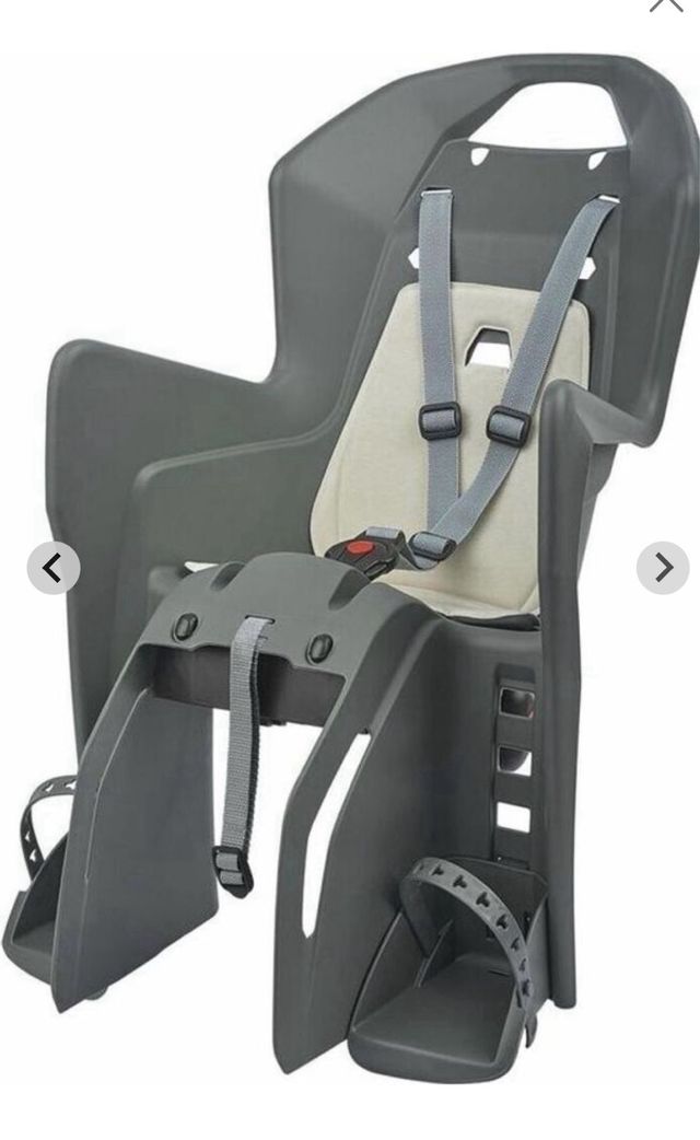 Detalles del productoSilla de seguridad para transportar niños en bicicleta. Fabricada en plástico resistente y con arneses de sujeción.