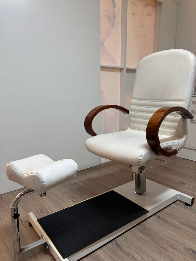Detalles del productoSillón de pedicura con reposapiés incorporado. Altura y rotación del sillón regulable mediante bomba hidráulica y sistema de bloqueo. Reposabrazos con acabado color negro alta calidad. Reposapiés giratorio ajustable en altura. Incluye una alfombrilla antideslizante en la zona de la bañera. Tapizado en PVC blanco fácil de limpiar.