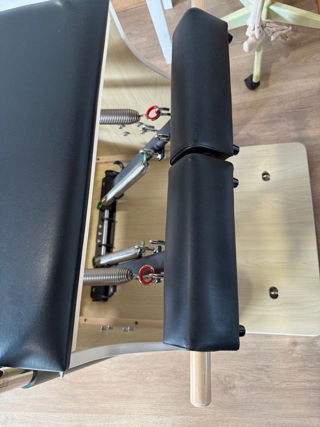 Silla de Pilates sin usar, lista para tu entrenamiento. - Tapicería negra. - Estructura de madera clara. - Resortes metálicos.