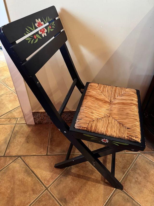 Silla plegable negra con asiento de mimbre