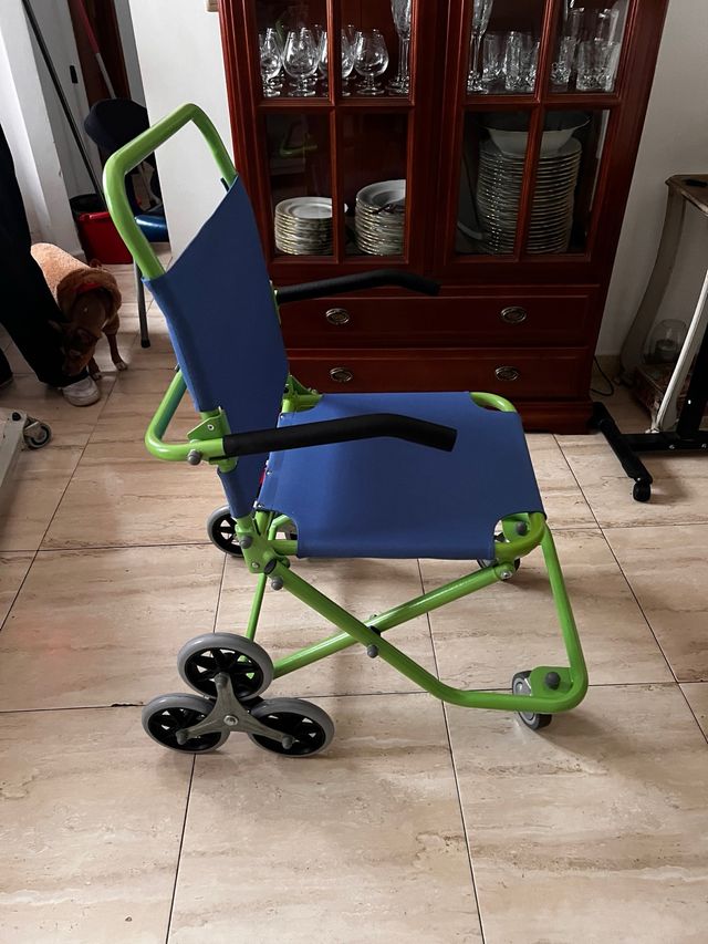Silla salvaescaleras con estructura de color verde y asiento azul. - Ruedas triples para facilitar el movimiento. - Reposabrazos negros.
