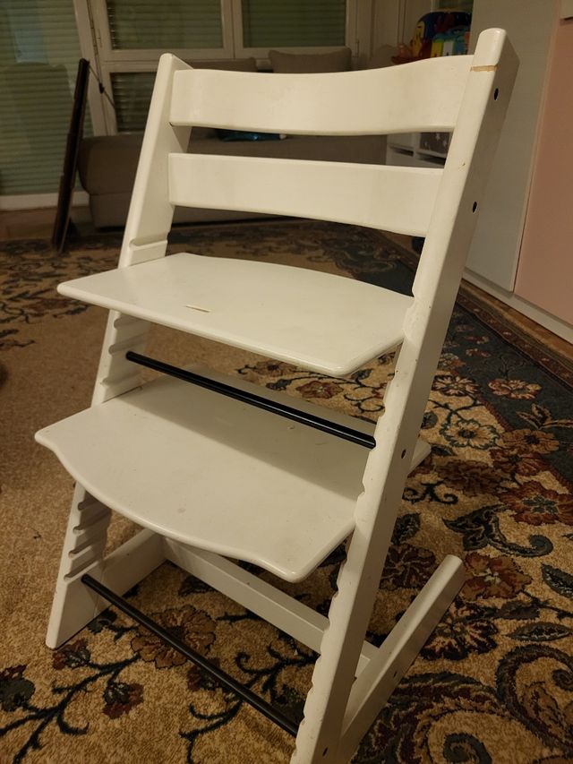 Detalles del productoSilla alta Stokke de color blanco, ideal para que los más pequeños coman y jueguen. Con accesorios y funda incluida