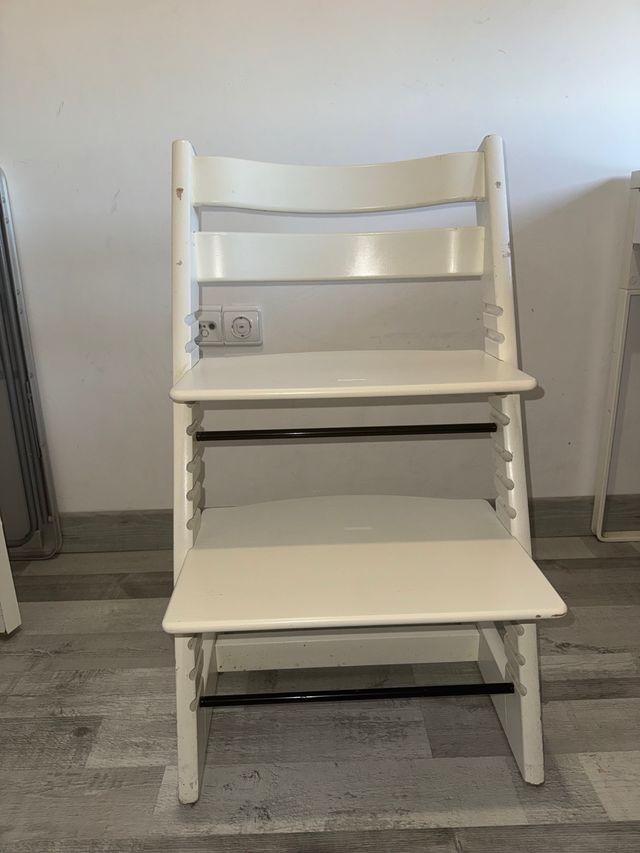 Silla alta Stokke en color blanco. Stokke Tripp Trapp - Diseño ergonómico. - Asiento y reposapiés ajustables. Es del 2017 , tiene marcas de uso pero tiene mucha vida todavía!