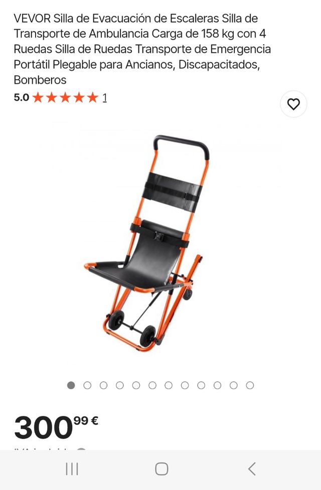Detalles del productoVendo silla porque me mudo y no la voy a necesitar para mi nueva casa. La compré para mi madre que usa silla de ruedas y la usamos tres veces para subir y bajar las escaleras de mi piso. Está nueva. Le rebajo el precio de 300 a 220.