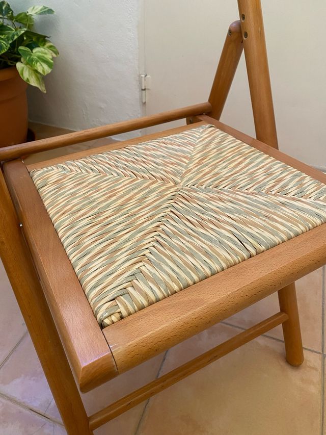 Conjunto de sillas plegables con estructura de madera de haya y asiento de ratán.