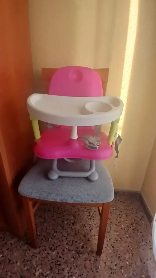 Detalles del productoSilleta elevadora para bebés en color rosa, diseñada para colocar sobre una silla.