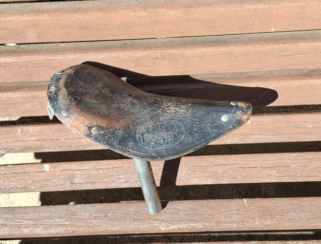 Sillin de cuero de antigua bicicleta de carreras de los años 50 marca francesa adga