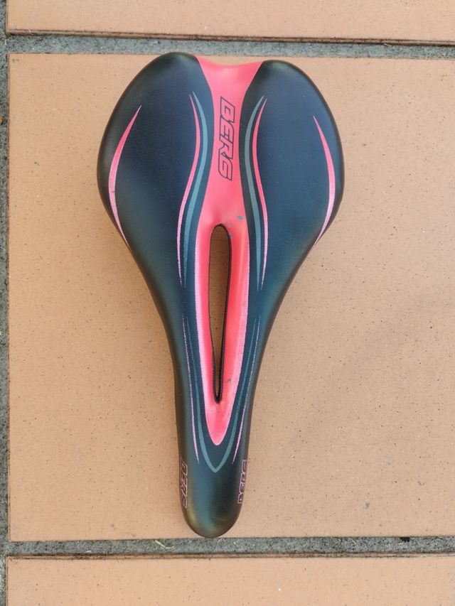 Sillín de bicicleta Bergs con un diseño deportivo en negro y detalles en rosa. - Diseño ergonómico. - Materiales resistentes.