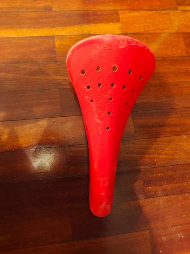 Detalles del productoSillín de bicicleta GES rojo, de estilo vintage. Es de plástico y tiene algunos signos de uso.