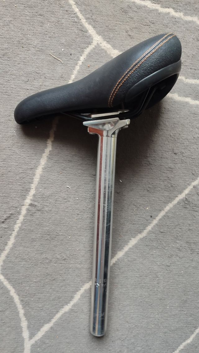 Sillín de bicicleta en color negro con detalles de costura en tono naranja. - Tubo de diámetro 27.2mm.