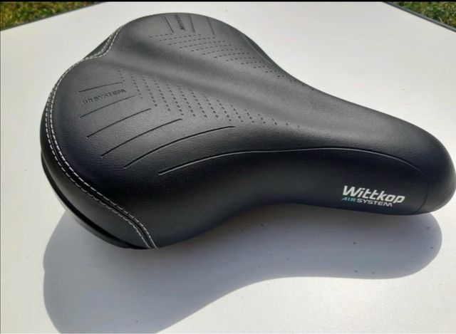 Detalles del productoSillín de bicicleta Wittkop Air System en perfecto estado. Es de color negro y tiene un diseño elegante.