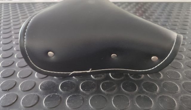 Sillín de bicicleta de estilo clásico, en color negro. - Diseño con remaches metálicos. - Costuras blancas de contraste.
