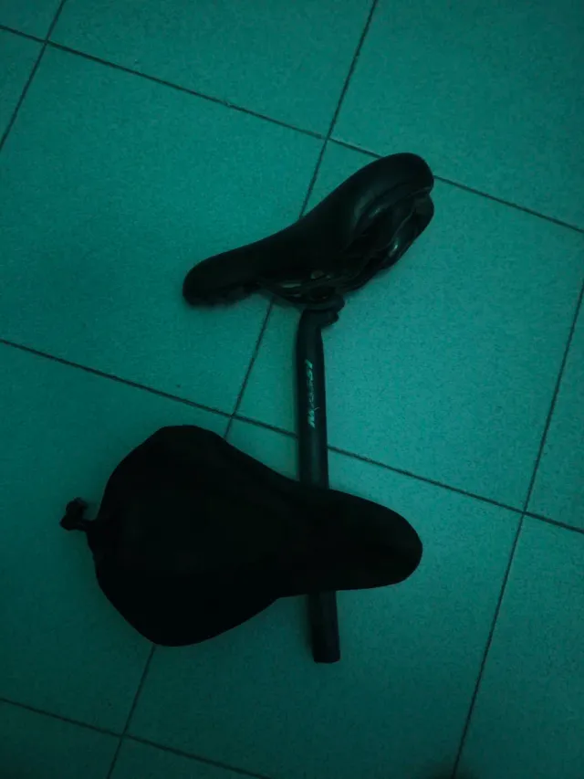Conjunto de sillín de bicicleta, tija y protector. - Sillín de bicicleta negro. - Tija de sillín. - Protector de sillín negro.