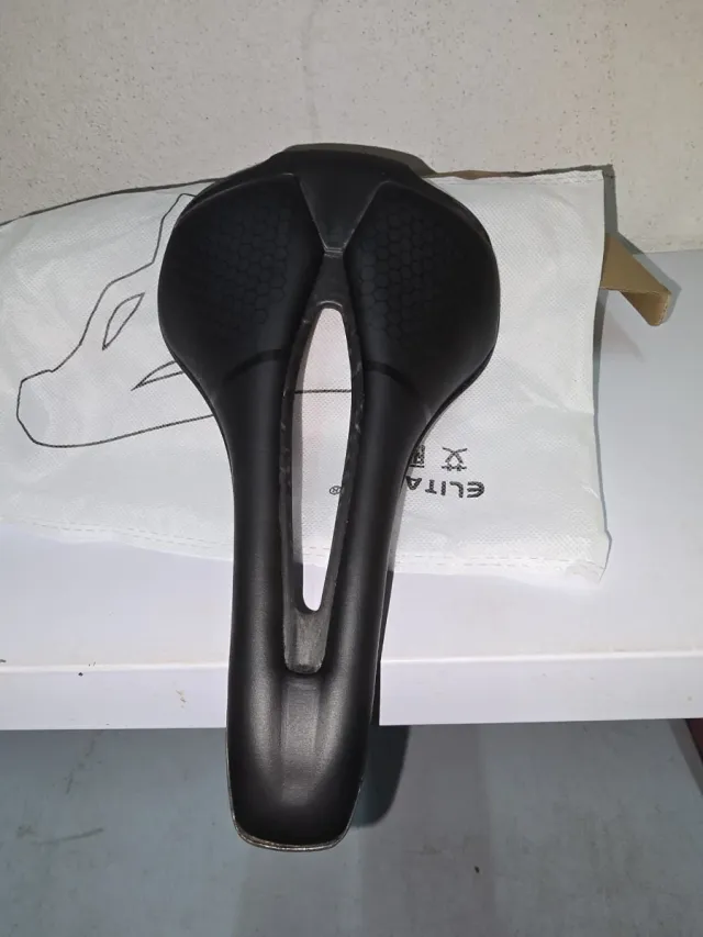Detalles del productoSillín de bicicleta en con un diseño moderno y ergonómico. Presenta un patrón de hexágonos en la parte superior y un canal central.