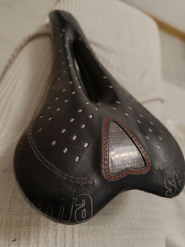 Detalles del productoSillín de bicicleta Selle Italia en color negro con detalles en naranja y carbono.