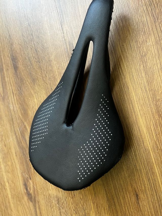 Sillín de bicicleta de diseño moderno y ultraligero. - Color negro. - Superficie con pequeños puntos blancos. - Diseño ergonómico con canal central. Con algún roce .