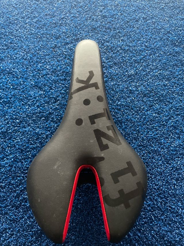 Sillín de bicicleta de la marca Fi:zk. - Color negro con detalles en rojo. - Diseño ergonómico. - railes 7x7mm