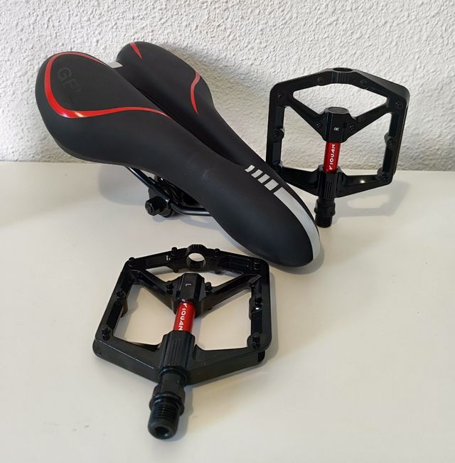 Conjunto de sillín ergonómico con acolchado de gel y pedales de aluminio ligeros, resistentes y antideslizantes. Perfecto para MTB, carretera o uso urbano. En muy buen estado, listos para montar y usar.