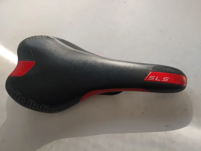 Sillín de bicicleta Selle Italia SLS en color negro con detalles en rojo. - Diseño ergonómico. - Marca: Selle Italia. - Modelo: SLS.
