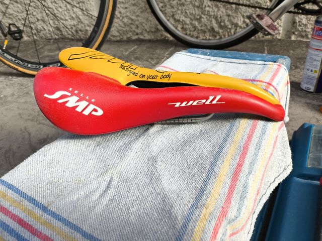 Sillín Selle SMP Well en color rojo y amarillo. - Diseño ergonómico. - Marca SMP.