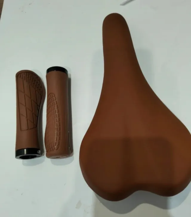 Detalles del productoSet de sillín y puños para bicicleta en color marrón. Nuevo a estrenar