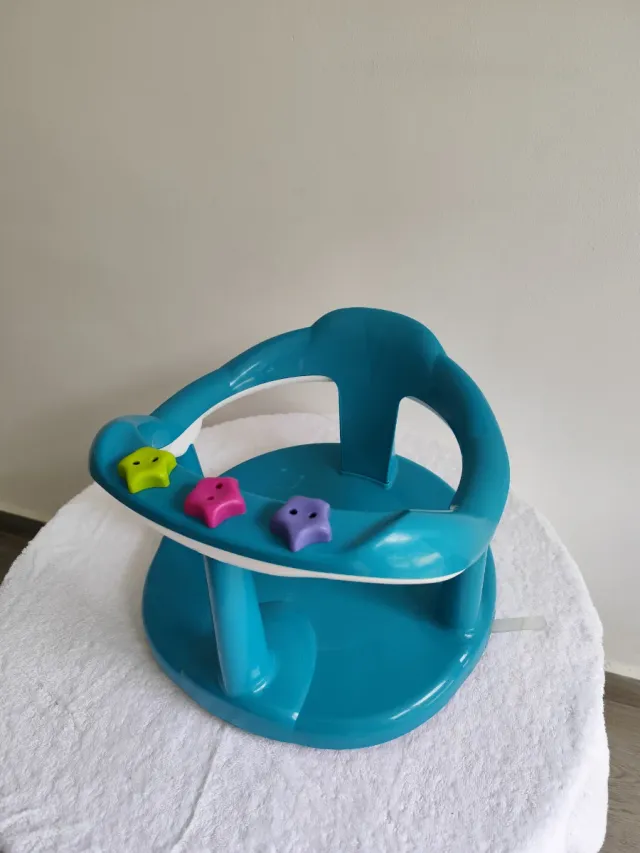 Sillita de baño de color azul para bebés. Cuenta con tres estrellas de juguete. - Diseño giratorio. - Estrellas de juguete en colores verde, rosa y morado.