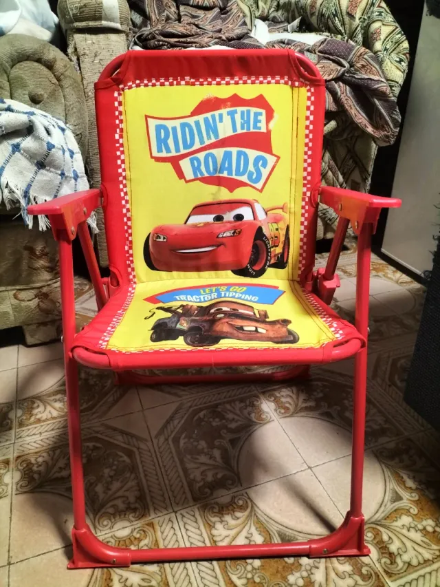 Sillita plegable infantil con diseño de Cars. - Estructura de metal roja. - Tejido amarillo con personajes de Cars. - Ideal para niños.