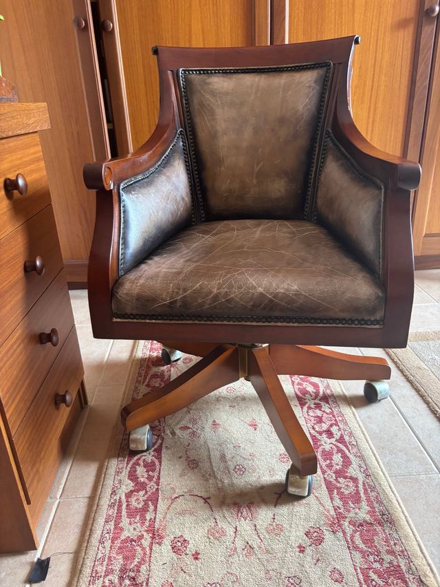 Detalles del productoElegante sillón de despacho con estructura de madera y asiento y respaldo tapizados en piel.