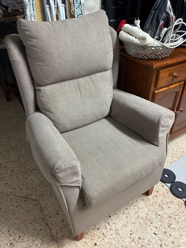 Sillón de tela beige y madera