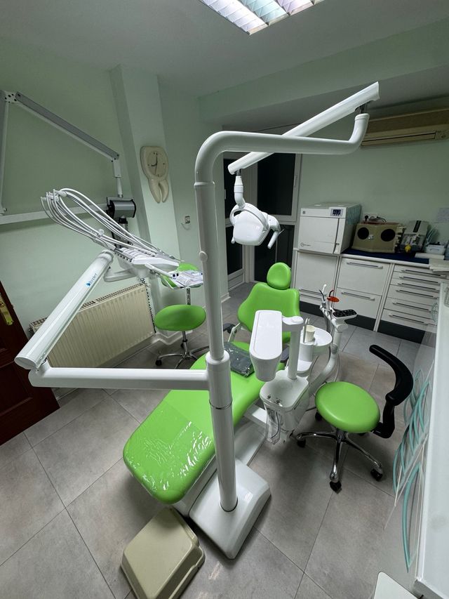 Sillón marca bondent , acoplamiento para 2 turbina , ultrasonido marca Woodpecker, lámpara polimerizar marca Woodpecker , la parte del igienista viene completa . 2 taburetes .