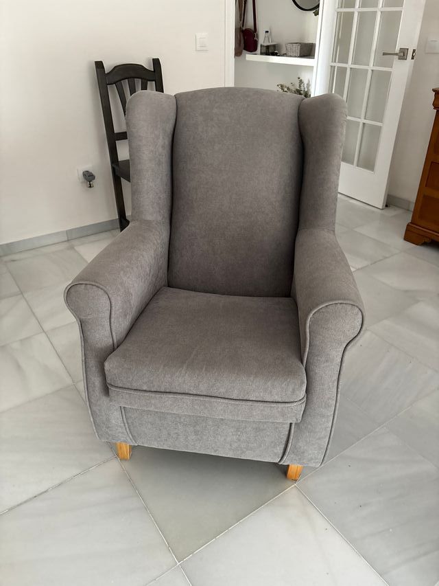 Sillón orejero gris de tela
