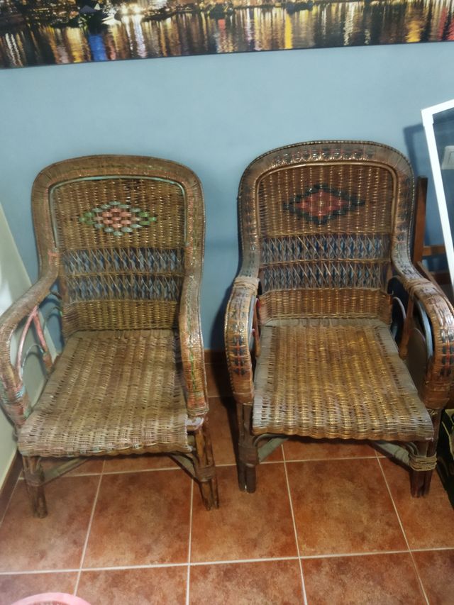Detalles del producto2 sillas/sillones de mimbre.se pueden usar tal cual están aunque les viene bien una pequeña restauración. Precio negociable. A recoger en Monforte Medidas del producto