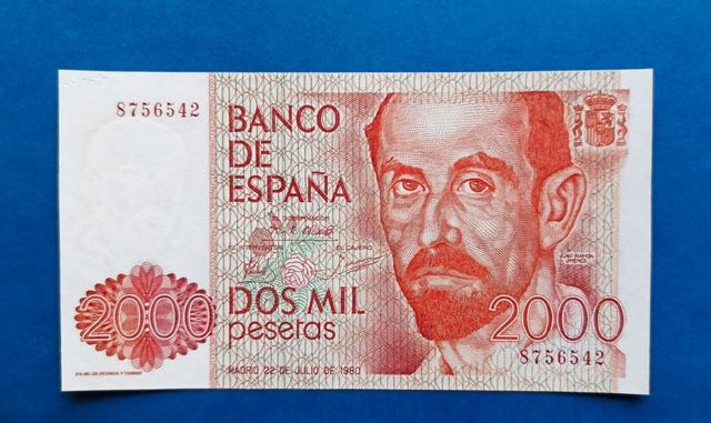 Leve arruguita del papel en esquina superior.Billete de 2000 pesetas del Banco de España, emitido en 1980. Presenta el retrato de Juan Ramón Jiménez.