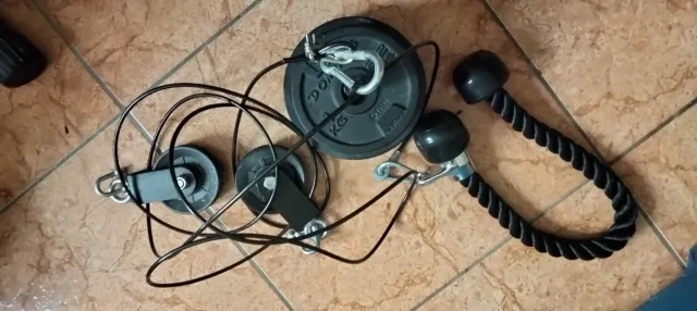 - Incluye polea, cable de acero, disco de peso y accesorio de cuerda.