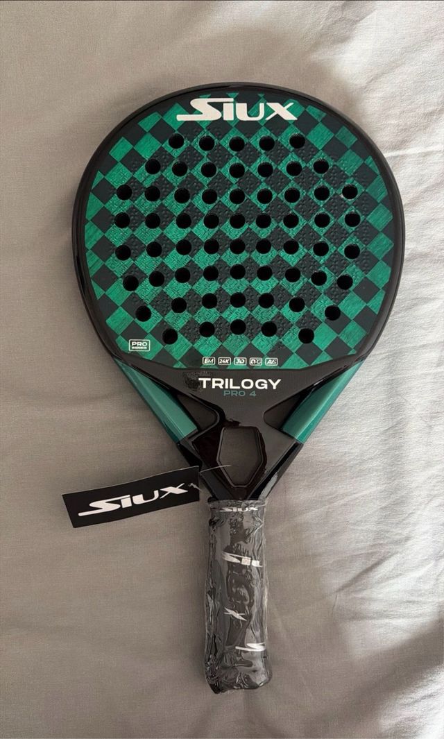 Pala de pádel Siux Trilogy Pro 4 con un diseño llamativo. - Acabado en negro y verde. - Logo de Siux en blanco.