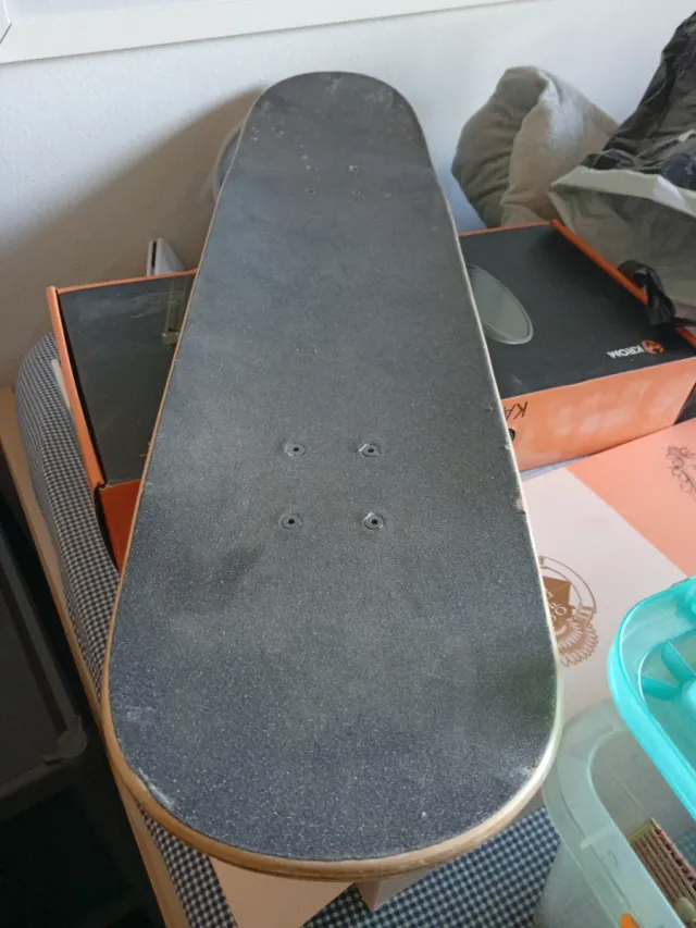 Skate board con lija. - Superficie de lija negra. - Tabla de madera.