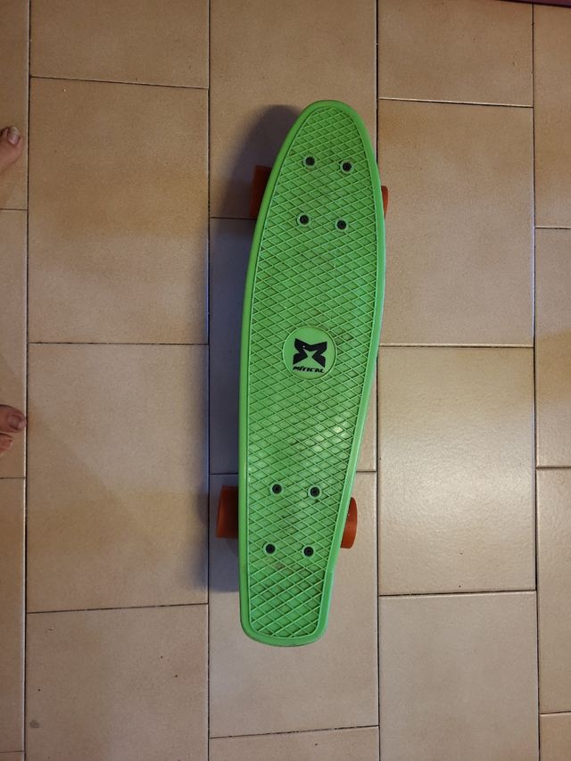 Skate clásico de color verde brillante, perfecto para paseos. - Diseño retro. - Ruedas naranjas.