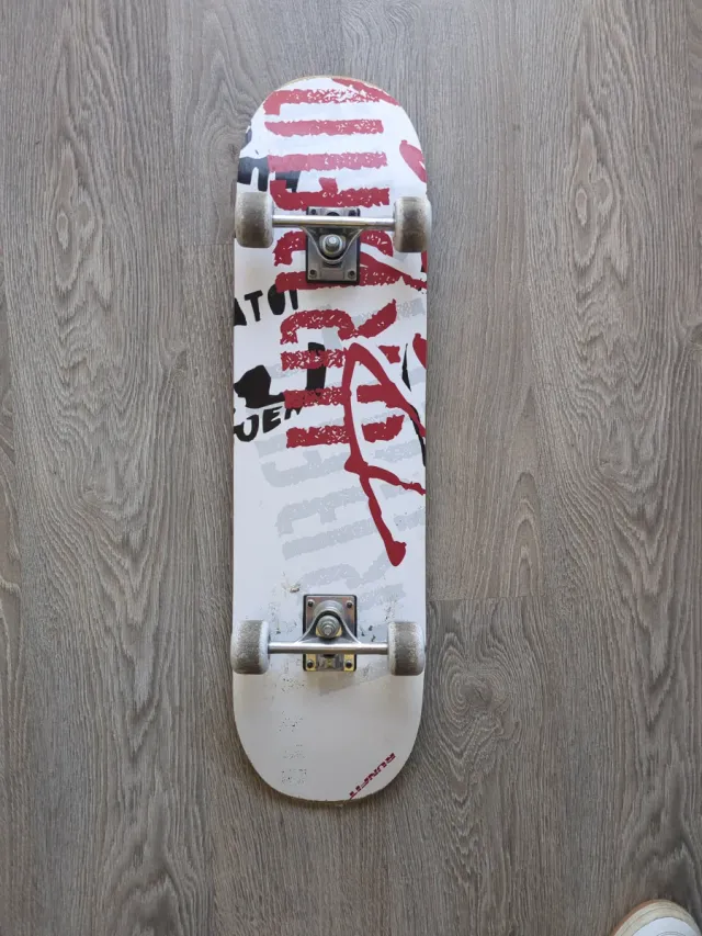 Skate con un diseño llamativo. Perfecto para los amantes del skate. - Diseño blanco con franjas rojas y detalles en negro. - Ruedas y ejes metálicos.