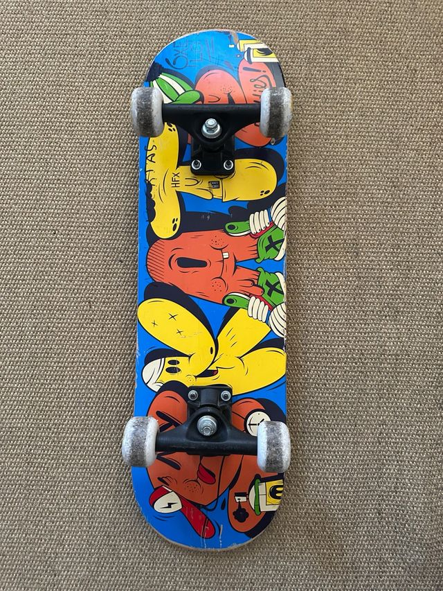 Skate con un diseño llamativo y colorido. - Tabla con ilustraciones originales. - Ejes y ruedas negros.