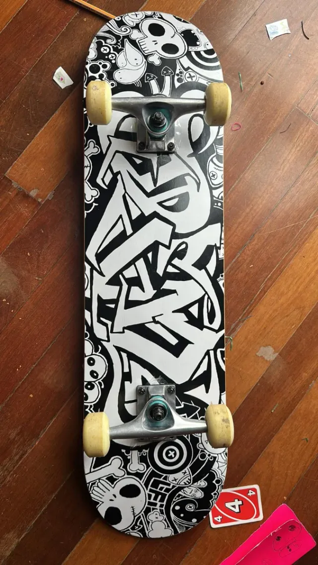 Detalles del productoTabla de skate con un diseño llamativo en blanco y negro. Presenta un estilo graffiti en el centro y motivos de calaveras y otros dibujos en los extremos.